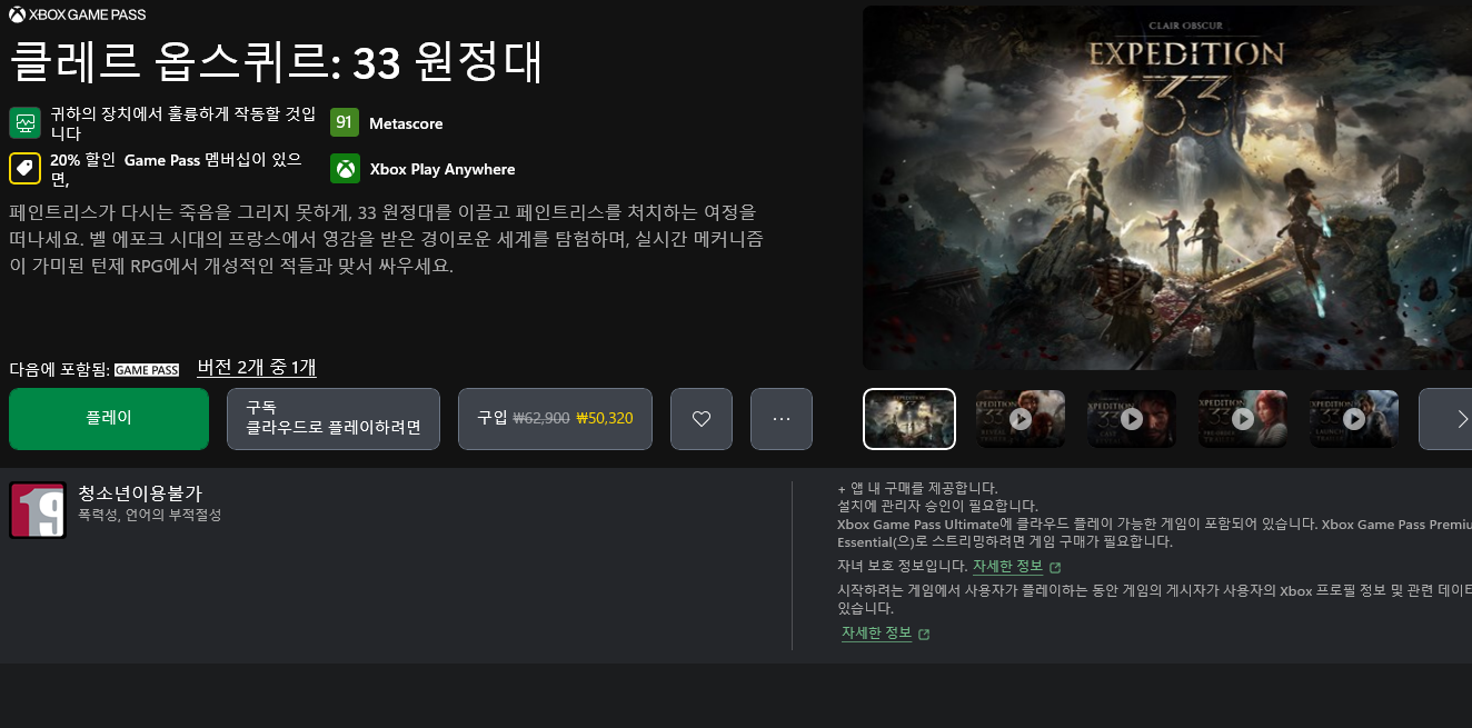 특히 개인적으로 만족도가 높았던 부분은 2025년 GOTY 수상작인 ‘클레르 옵스퀴르: 33 원정대’를 별도 구매 없이 바로 플레이할 수 있다는 점이었습니다. 이 작품은 스토리와 연출, 전투 템포 모두 뛰어나서 단순 체험 수준이 아니라 끝까지 즐길 가치가 충분한 게임인데, 이런 작품을 구독 서비스로 바로 즐길 수 있다는 점에서 체감 가치는 상당히 큽니다.