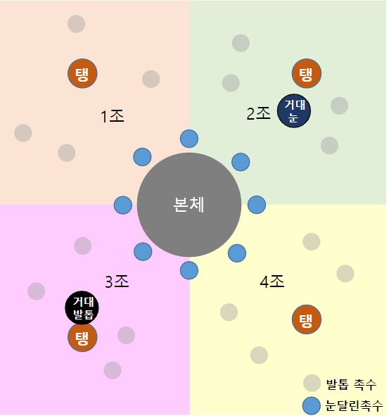 - 12시 방향에서 탱들이 모여 같이 탱킹을 해주며, 어그로를 확보 해주며,