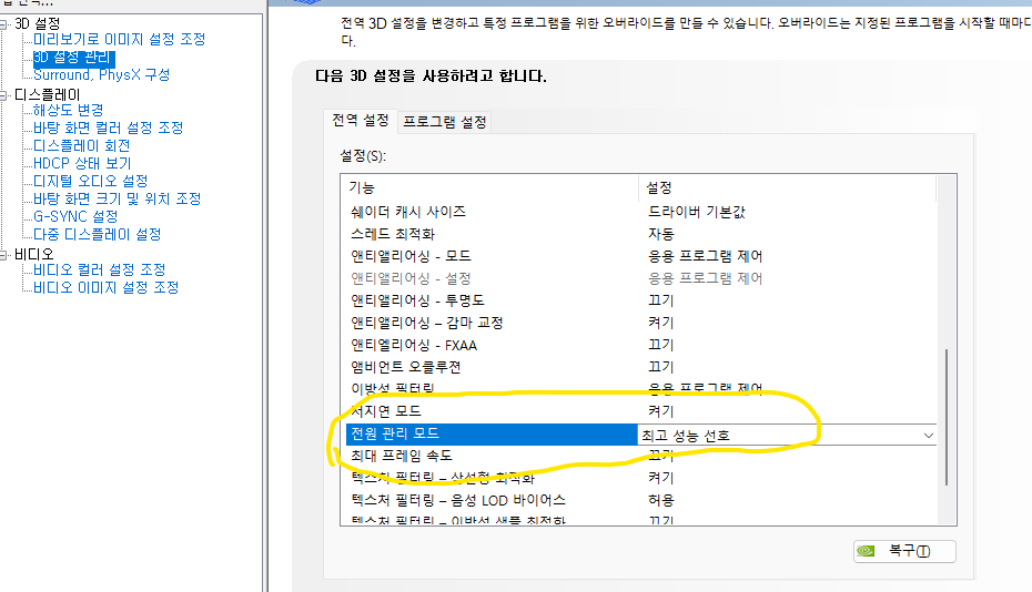 - 전원 관리 → 최대 성능 선호