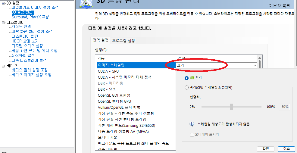 Nvidia 제어판 → 3D설정관리→ 이미지 스케일링 (끄기)