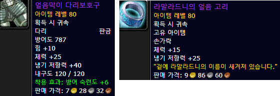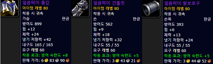 - 얼음막이 팔보호구 : 얼어붙은 룬 4개 + 토륨 주괴 12개 + 아케이나이트 주괴 2개 + 물의정수 2개