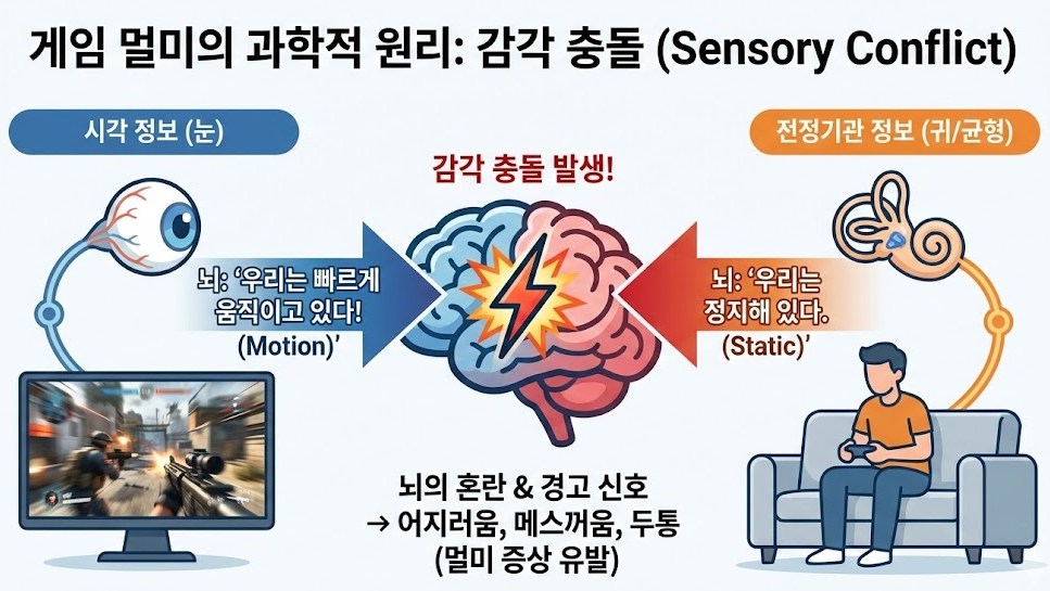 게임 멀미의 핵심은 감각 충돌(Sensory Conflict)입니다.