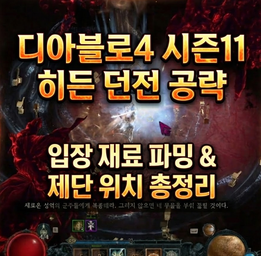디아블로4 시즌11이 '축성'이라는 신규 시스템과 담금질 개편, 재료 수급 완화 등으로 유저들에게 호평을 받고 있습니다. 파밍의 재미가 돌아왔다는 평이 지배적인 가운데, 디아블로2의 '카우방'을 연상케 하는 히든 던전 존재하여 많은 분이 도전하고 있습니다. 이번 글에서는 시즌11 히든 던전을 열기 위한 4가지 재료 수급처와 제단 활성화 위치를 정리해 드립니다.