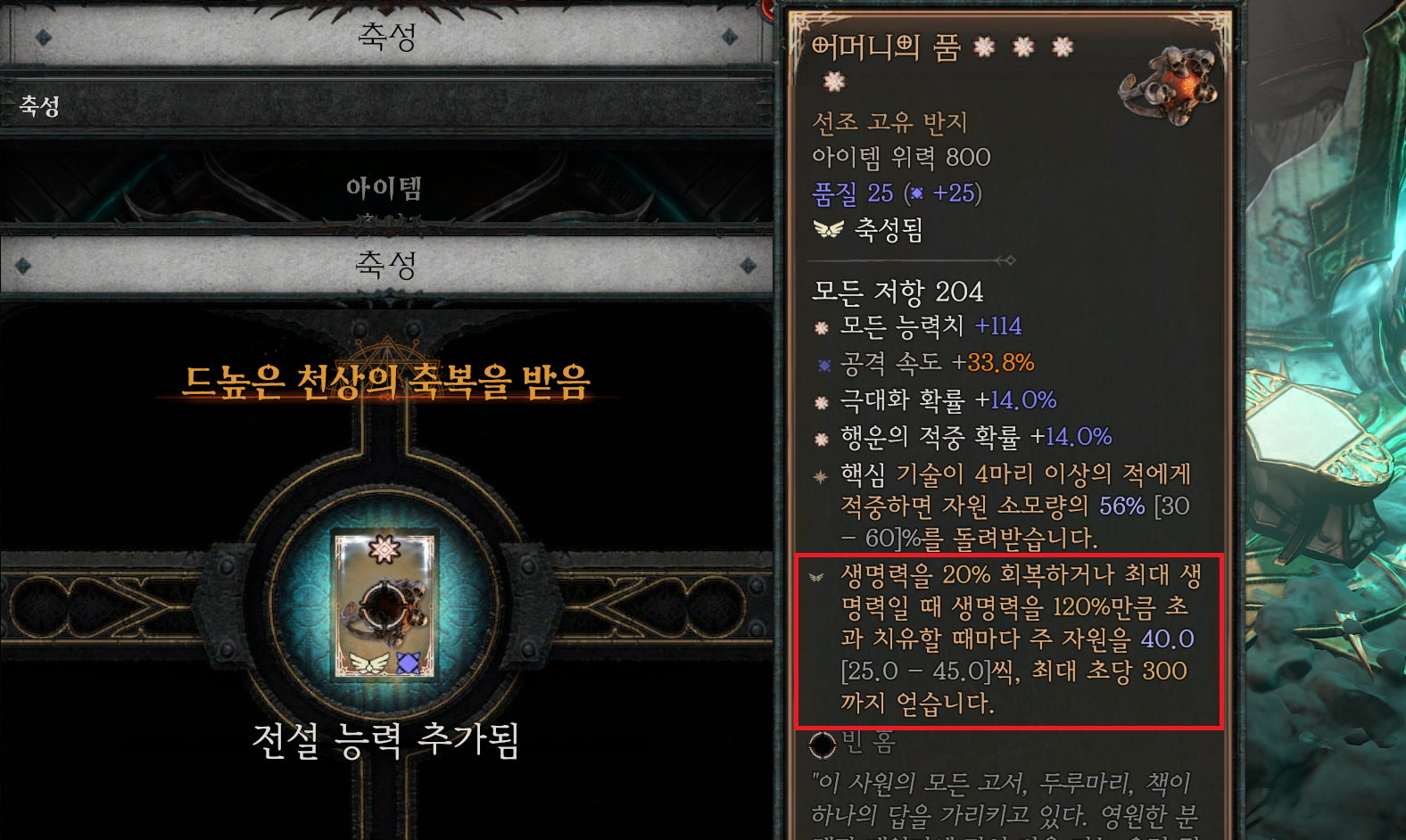 신화고유 및 졸업금 전설 아이템에 ‘신화 고유 옵션’이 축성으로 붙는 경우입니다.