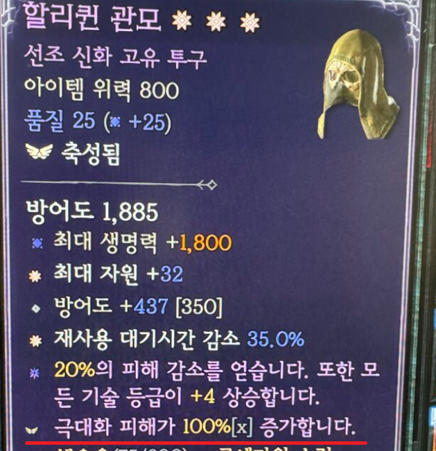 - 졸업급 무기에 축성을 했는데, 한아비(할배검) 고유 옵션(극대화피해 100%) 이 붙는 경우