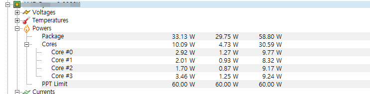 위 이미지는 HWMonitor에서 CPU 전력 사용량을 확인한 모습입니다.